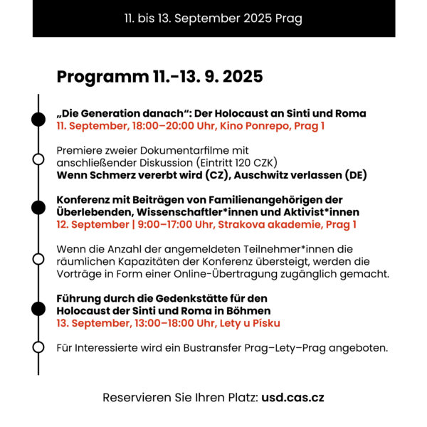 Wir laden Sie herzlich zu einer tschechisch-deutschen Konferenz ein, die dem Gedenken an die Opfer des Holocausts an Roma und Sinti gewidmet ist und vom 11. bis 13. September in Prag und Lety (Südböhmen) stattfindet. Auf der Konferenz mit dem Titel „Das Erbe der überlebenden Roma und Sinti über Generationen hinweg“ treffen sich Nachkommen von Überlebenden, Historiker, Forscher, Aktivisten und Vertreter öffentlicher Institutionen, um gemeinsam über die aktuellen Formen des Gedenkens an diese Tragödie, die Politik der Erinnerung, die generationsübergreifende Weitergabe von Traumata und die ethischen Herausforderungen im Zusammenhang mit der Erforschung des Völkermords an Roma und Sinti zu diskutieren.