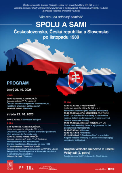 Česko-slovenská komise historiků, Ústav pro soudobé dějiny AV ČR, v.v.i., katedra historie FP TUL a KVKLI zvou na odborný seminář Spolu a sami. Československo, Česká republika a Slovensko po listopadu 1989, který se bude konat ve dnech 21.10. a 22.10. 2025 ve 2 p. Krajské vědecké knihovny v Liberci.